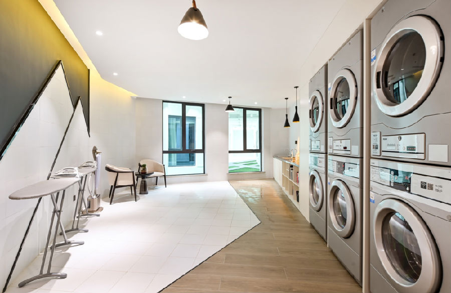 “出尘”专门为顾客提供洗衣、熨烫等一系列清洁服务,有自助洗衣房专业的洗涤烘干设备和洗衣消毒用品。